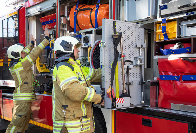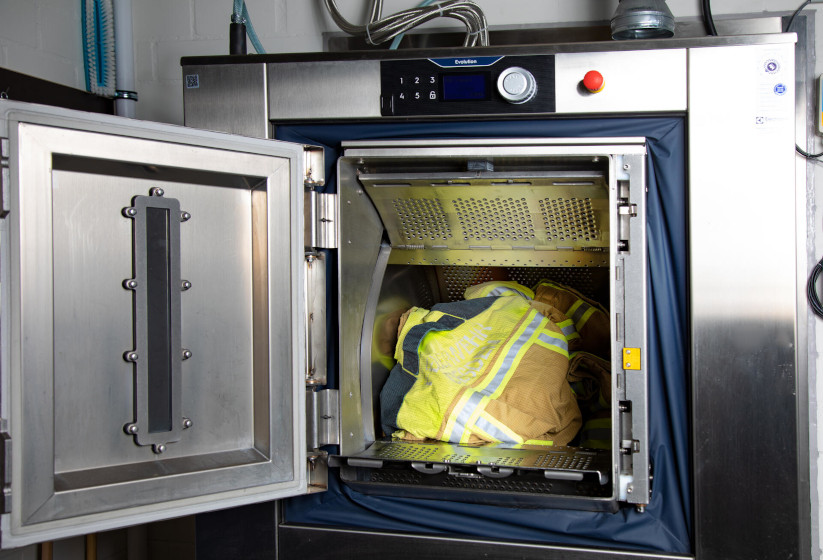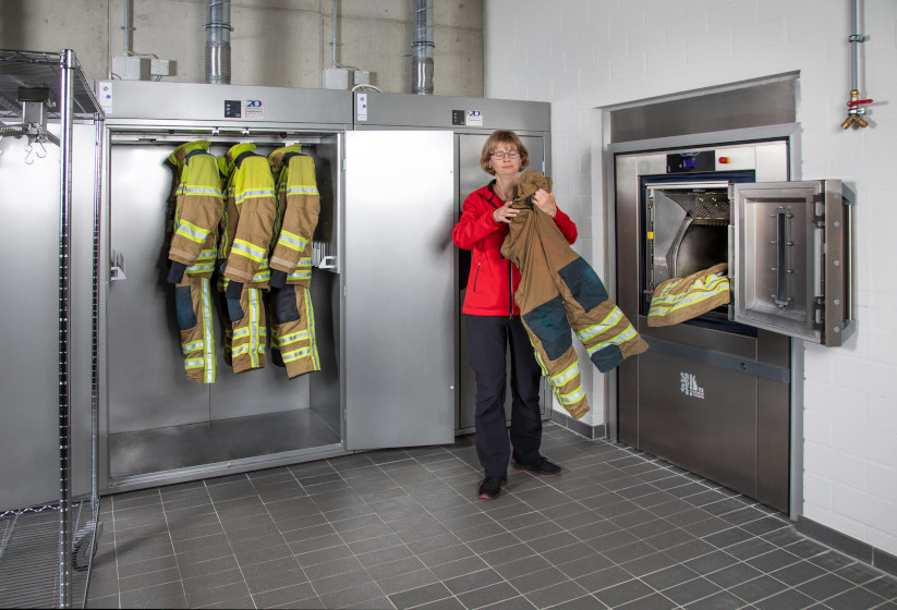 Für die Wäscherei der Schutzausrüstung wurden zwei Electrolux Professional WB6-27 Barrier-Waschmaschinen und DC6-15 Trockenschränke ausgewählt, um die regelmäßige Aufbereitung der technischen Schutzkleidung nach Einsätzen zu unterstützen. Diese Maschinen ermöglichen eine präzise Dosierung von Reinigungsmitteln basierend auf dem Gewicht der Ladung, wodurch die Schutzeigenschaften der Ausrüstung erhalten bleiben und zugleich Prozesssicherheit sowie die Einhaltung von Hygienestandards gewährleistet werden. Das System wurde für effiziente Arbeitsabläufe konzipiert, sodass die Ausrüstung der Feuerwehrleute professionell aufbereitet und ohne Verzögerung für den nächsten Einsatz bereitsteht.