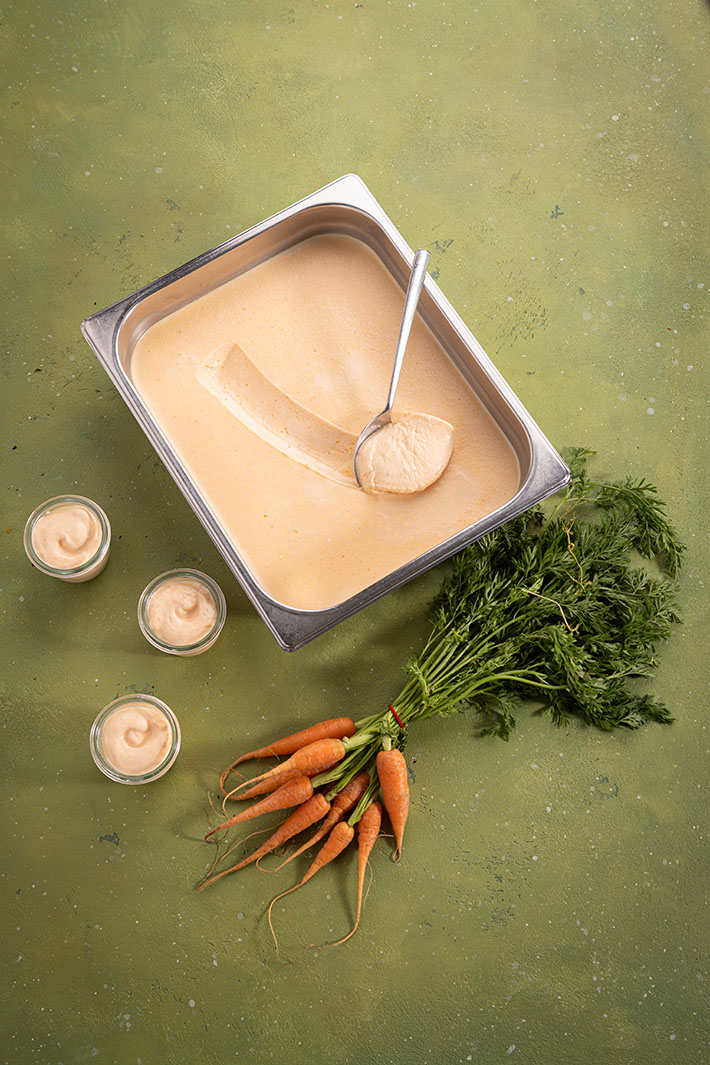 Vierte todos los ingredientes en una bandeja de acero inoxidable GN1/1 65mm de altura y bátelos juntos. Mientras tanto, inicia el programa automático “Carrot Fermentation” (Fermentación de Zanahoria) en tu SkyLine ChillS y carga la bandeja. Este ciclo combina la ferementación y un ciclo de enfriamiento emparejado.